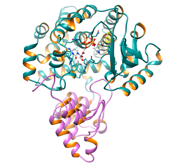 Cristallographic structure of AnkX trapped in complex with its substrate (shown in stick) before enzymatic cleavage (© Valérie Campanacci, LEBS).