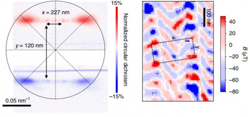 Les mesures REXS dichroïques au seuil K de l'oxygène révèlent d'abord la chiralité de l'ordre ferroélectrique grâce à l'inversion du contraste dichroïque. La diffusion des rayons X magnétiques au seuil L du fer révèle l’ordre magnétique et la présence de deux cycloïdes hébergées dans chaque domaine ferroélectrique et se propageant dans des directions alternées. Ces mesures dans l’espace réciproque (Figure b - gauche) sont corroborées par la magnétométrie NV à balayage qui donne une image dans l’espace réel (Figure b - droite) et les simulations. Grâce au flux élevé de photons, le motif diffracté révèle également la présence de bulles chirales antiferromagnétiques périodiques formées par la couture de cycloïdes antiferromagnétiques aux parois des domaines ferroélectriques.