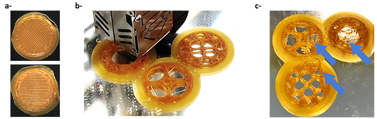 Figure 3 : Pastilles imprimées 3D à 130°C de zéine plastifiée par 20m% de glycérol (matériau A, en haut) et 10m% glycérol + 10m% PA-LI (matériau B, en bas) avec ⌀Pastille=20mm (a-). Impression 3D de pièces complexes à base de zéine : matériau A (b-) et matériau B (c-).