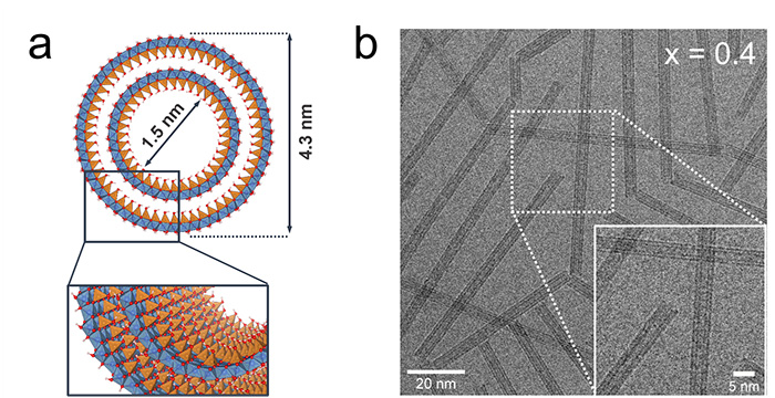 La première étape vers l'utilisation de ces nanotubes en photocatalyse et l'exploitation de la séparation des charges favorisée par la polarisation à travers leurs parois consiste à réduire leur bande interdite. Un consortium international dirigé par des chercheurs du Laboratoire de Physique des Solides d’Orsay a étudié le potentiel des nanotubes d'imogolite synthétiques à double paroi (figure 1a) pour des applications photocatalytiques. Dans le but de transformer l'imogolite, matériau non photo-actif, en un photocatalyseur efficace pour la génération de H2, les scientifiques ont substitué une partie des atomes de Ge contenus dans les molécules composant les nanotubes par des atomes de Ti (dopage). Divers échantillons Ti/Ge sont préparés en modifiant le rapport initial des précurseurs3 x = [Ti]/([Ge]+[Ti]). Les études morphologiques par diffusion des rayons X et par cryo-microscopie électronique à transmission conventionnelle révèlent la préservation de la forme du nanotube jusqu'à x = 0,4 (figure 1b).