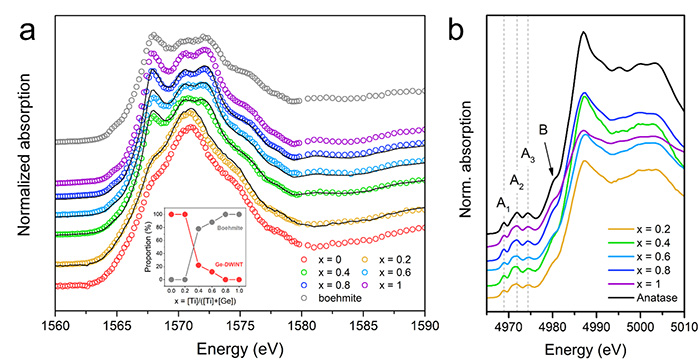 La compréhension des modifications structurales locales des nanotubes est essentielle pour une étude plus approfondie des propriétés photoinduites de ces nanostructures dopées. Pour confirmer la modification induite par le dopage, une caractérisation multi-échelle a été réalisée en combinant différentes spectroscopies de rayons X et en particulier la spectroscopie d'absorption XANES sur la ligne de lumière LUCIA. Le XANES au seuil K de l'Aluminium révèle une large bande d'absorption située à 1571 eV, caractéristique de l'Al dans une configuration octaédrique (Figure 2a). Une résonance de plus faible énergie apparaît à 1567 eV avec l'augmentation du rapport de précurseur, ce qui est lié à la présence d'un sous-produit, de la boehmite d'Aluminium (oxyhydroxyde d’aluminium AlO(OH)), comme l'a démontré l'ajustement par combinaison linéaire des spectres XANES. Les spectres XANES au seuil K du Ti présentent les modes caractéristiques du pré-seuil attribués aux transitions dipolaires 1s à 3d du Ti4+ en configuration octaédrique. Ces résultats indiquent que les atomes de Ti semblent remplacer préférentiellement les atomes d'Aluminium.