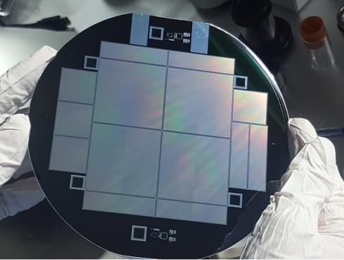 Figure 2 : Galette de Silicium comportant plusieurs géométries de modules de pixels hybrides pour les futurs détecteurs