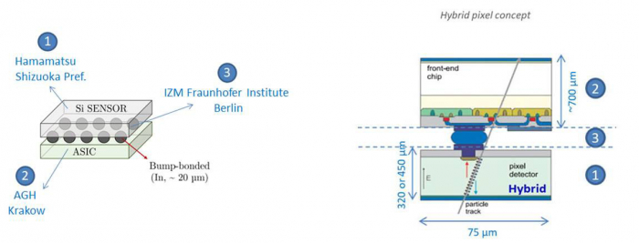 Ce détecteur utilise la technologie bien connue des pixels hybrides. Le détecteur se présente sous forme de plusieurs modules de matrices de pixels. Chaque pixel fait 75 µm de côté. Les pixels hybrides, qui sont des objets de haute technologie, ont la particularité d’être composés de 2 circuits micro-électroniques, empilés comme un sandwich, et interconnectés entre eux (voir illustration du concept en Figure 1).
