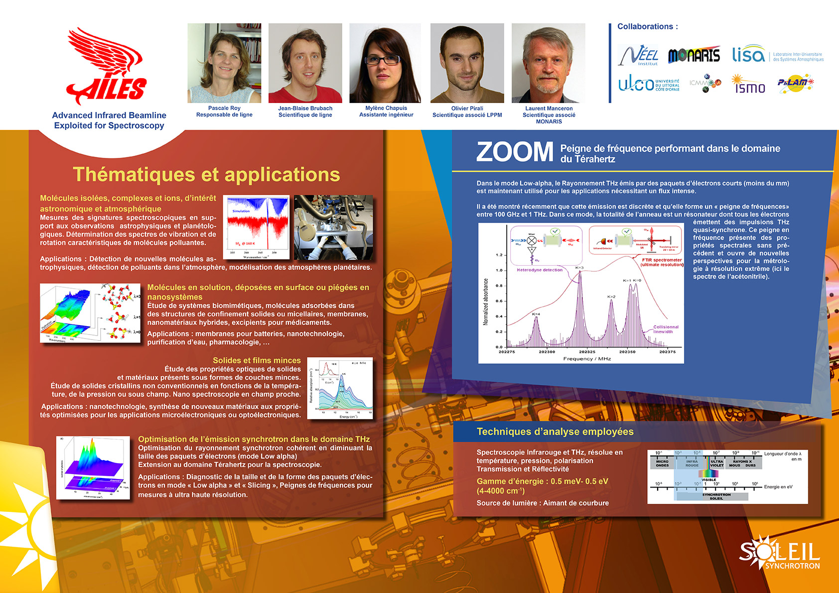 La ligne de lumière AILES est optimisée pour la spectroscopie d’absorption infrarouge de la matière condensée jusqu’aux molécules en phase gazeuse. Le domaine spectral couvert s’étend de l’infrarouge moyen aux ondes submillimétriques (ou THz), mais le performances les plus intéressantes sont obtenues entre 8 et 1000 cm-1. Les sujets de recherche développés sur AILES vont de la spectroscopie moléculaire aux études des propriétés optiques des matériaux, avec un large éventail de sujets se rapportant à la physique, la chimie et la biologie.